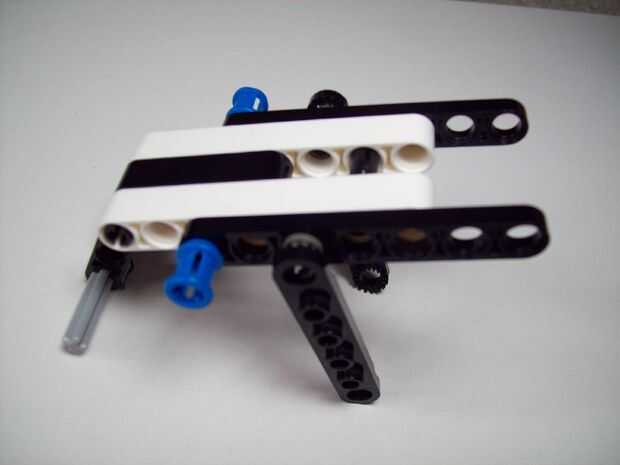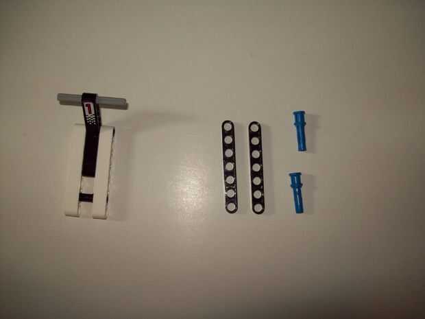 Luego, con 1 perno entre el pin azul y el segundo conjunto de montajes, añadir un pasador largo del perno prisionero gris 1.5 con el lado largo en y fije el segundo conjunto de soportes con los pernos hacia fuera. Una vez más, utilizar la imagen como una ayuda visual. Lo mismo para ambos lados.