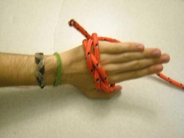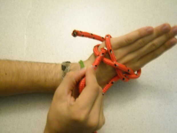 Voltear su mano. Con la punta principal cruzada sobre la izquierda enrollar y bajo el derecho de envolver.