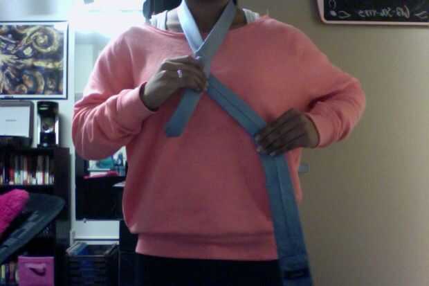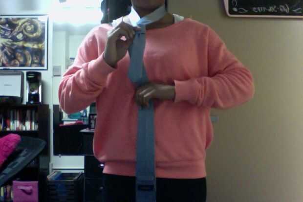• Agarra el lado ancho de la corbata con la mano derecha y tire de él detrás de la parte doblada.