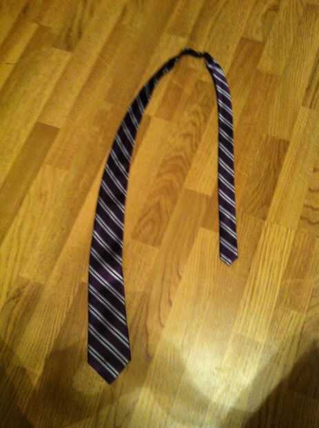 Inicio con el extremo ancho de la corbata en el lado derecho mientras que aproximadamente un pie más que el extremo estrecho de la izquierda.