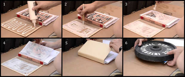 Cuando todo se pega, pones pesas sobre el libro cerrado y deje que el pegamento sequen durante mucho tiempo (varias horas). Utilice tableros planos agradables para evitar abolladuras en la cubierta de cuero.