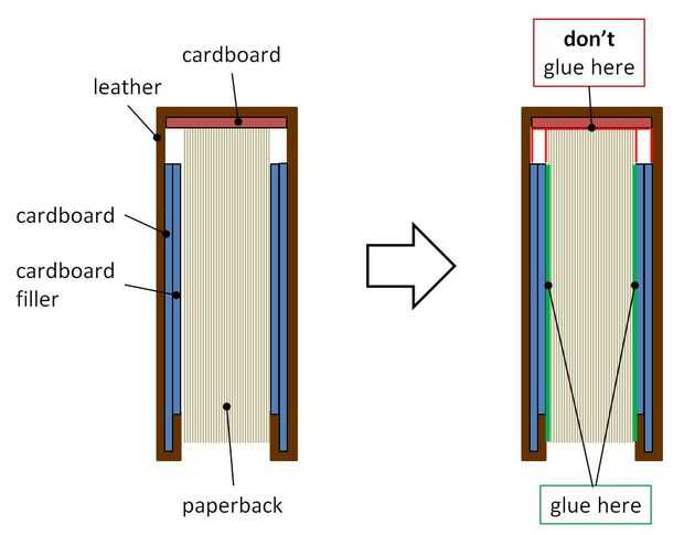 Pegar una cubierta a la vez, asegurándose de que la nueva cubierta de cuero cuelga sobre el borde del libro en rústica de 1/8" por todos lados.