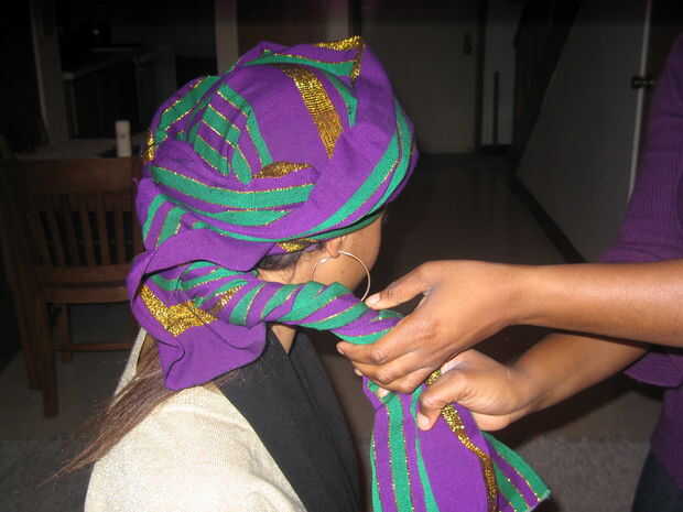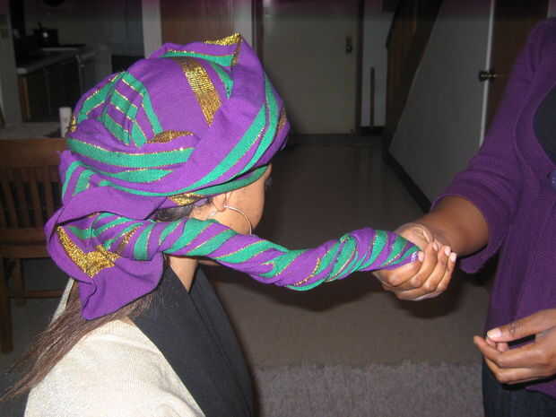 el lado izquierdo de la bufanda de la cabeza y empezar rodando desde la parte posterior de la cabeza/de la bufanda hacia el frente,