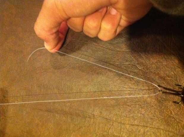 Lo primero que vas a necesitar hacer es enhile el sedal a través del ojo del anzuelo o señuelo. Doble vuelta a unos 5 o 6 pulgadas.