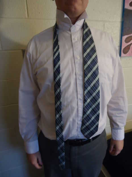 La corbata de Eldredge utiliza solamente el extremo más delgado de la corbata, y utiliza mucho de él. Por lo tanto, es importante que comencemos con tanto más fino será el extremo como sea posible. El extremo más grueso no se moverá en absoluto y permanece la misma longitud que cuando se inicia el proceso. No importa qué lado es el extremo más fino o más grueso, pero para estas instrucciones, estamos suponiendo que el extremo más delgado es el hombro derecho y el extremo más grueso en el hombro izquierdo.