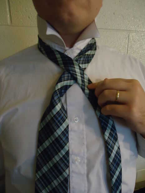 Cruz el extremo más delgado sobre el extremo más grueso cerca del cuello. Mantenga el nudo cerca del cuello, ya no seremos capaces de moverse mucho cuando terminamos.
