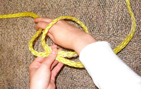 Llegar a mano derecha a través del lazo y asir un asimiento de la cuerda en el lado izquierdo.