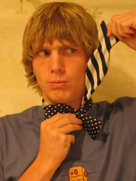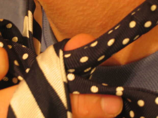 Como bajar la pieza rayada, un agujero se forma entre la polka puntos y rayas de pedazos de material. Asegúrese de que mantener un dedo dentro de ese agujero que fue creado. Debe estar en la parte posterior de la corbata al lado de su cuello.