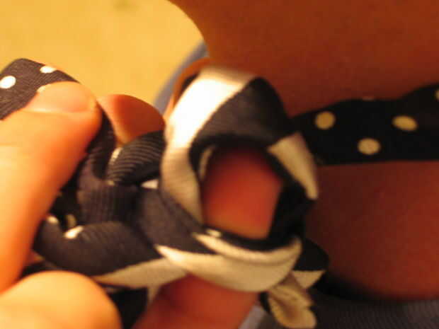 a continuación, llevar el lado rayas alrededor de la parte inferior de la corbata de moño y empújelo a través del orificio hecho por el dedo. Asegúrese de que empujas un doble pieza de la tela rayada a través para formar un bucle.