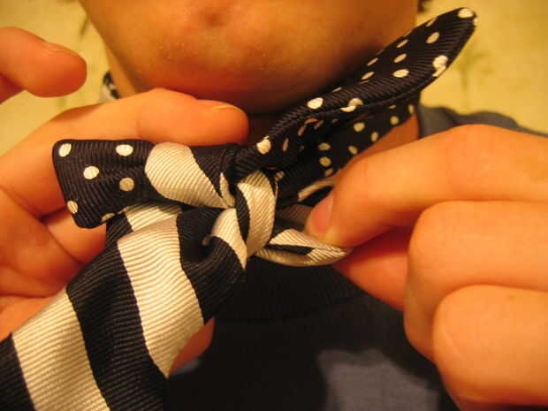 Ahora tire del extremo rayas a través del agujero, haciendo el lazo más grande. En este paso, usted necesita tener cuidado de que no tire demasiado, el lazo que daría como resultado un gran desordenado nudo alrededor de su cuello.