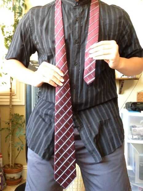 Aquí es donde te alinean la corbata. Esto determinará cuánto será la corbata. Hay dos extremos de la corbata, uno grueso y uno delgado. Derecho de personas zurdas generalmente tendrá su lado grueso en su derecho y y el fino lateral en la izquierda, viceversa para los zurdos. El más largo es el lado grueso de la corbata, más su corbata atada final.