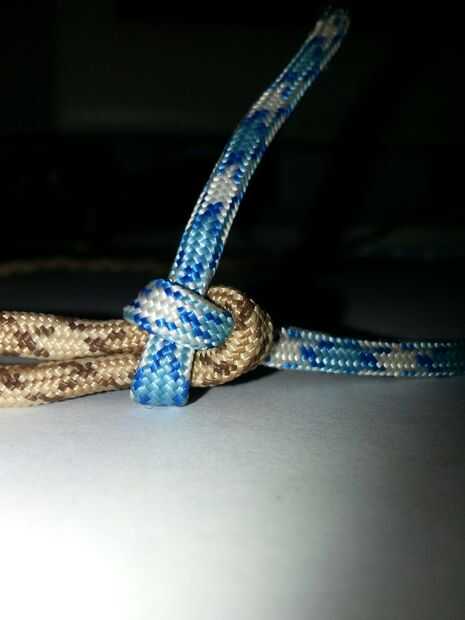 este nudo se utiliza para unir dos cuerdas de diferentes diámetros. Este nudo es más fuerte que el nudo de hoja curvaPaso 1: Hacer un brillante en el más grande de los dos cables a unir.Paso 2: Meta la segunda línea y tuck para arriba a través de la