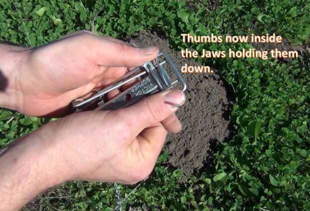 Mientras sigue apretando, deslice los pulgares uno a la vez sobre la parte horizontal de la mandíbulas. Esto puede parecer un poco peligroso, pero hacerlo es mucho más fácil como el apalancamiento obtenido hace más fácil mantener la trampa abierta.