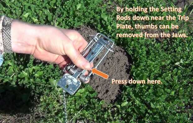 Manteniendo las Barras de ajuste cerca de la placa del viaje, debería poder quitar los pulgares de dentro de las mandíbulas. Si se liberan las Barras de ajuste , se partió la trampa. Asegúrese de mantener las Barras de ajuste presionado y sólo en el caso, asegúrese de que no permitan que nada faltaría perder de conseguir al alcance de la quijada .