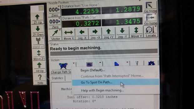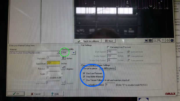 En hacer, hicimos nuestro primer corte con la selección de "Material muy frágil", detuvo la máquina, apagada el material frágil creación, hace la máquina -> ir al punto en el camino, fue a donde una pausa y comenzó a chorro en el ladrillo!