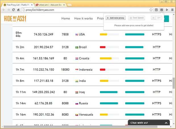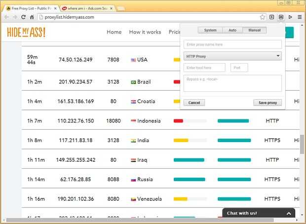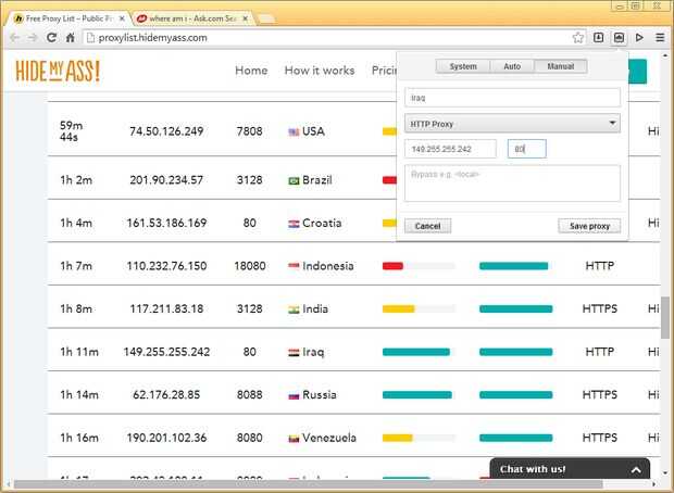 Abra cualquier web que proporciona direcciones IP libres (e.g. HideMyAss) y encontrar una sana. Para este tutorial he elegido a iraquí proxy. Luego siga los pasos: