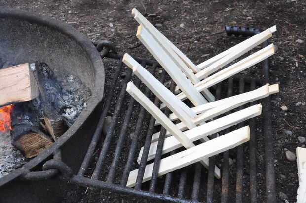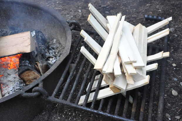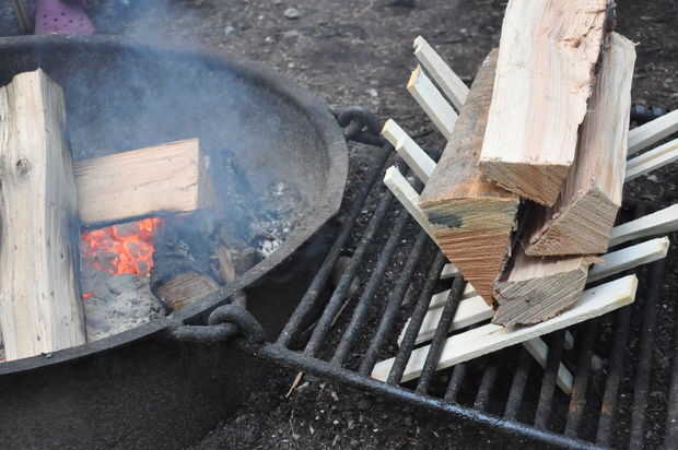 Añadir unas cuantas tiras más de leña a la rejilla de la hoguera, para celebrar (y aire hacia fuera) su pila de astillas o trozos grandes de leña.