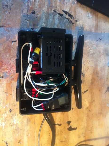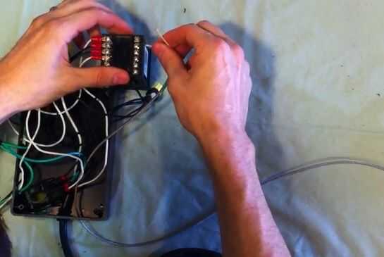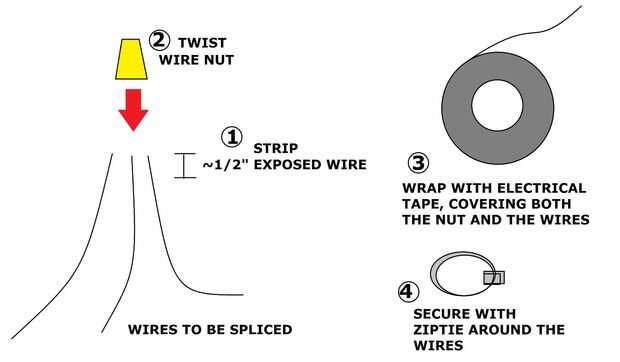 Para el las uniones de alambre usé tuercas para alambre reforzadas con cinta y un lazo del cierre relámpago. Ten en cuenta que usted nunca verá este tipo de conexión en un producto profesional pero la usé aquí porque es simple, resistente al agua, barato, eficaz y sobre todo compacto. (Solo no se ven bien y no se presta bien para agregar o quitar los cables rápidamente.) Si desea hacerlo bien sería utilizar a algún tipo de bloques de terminales.