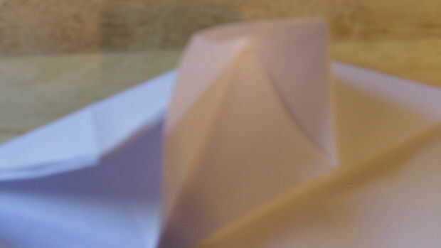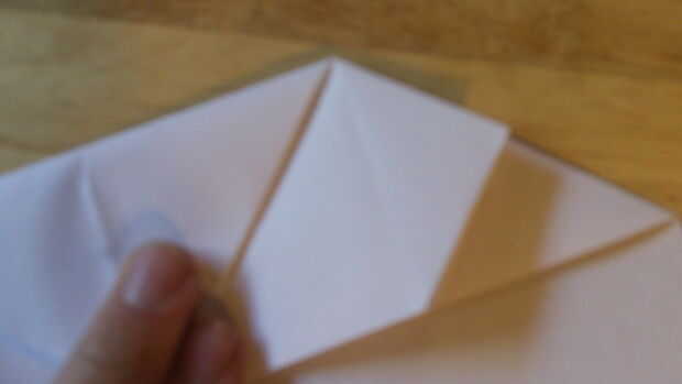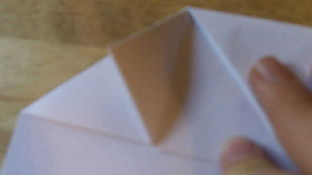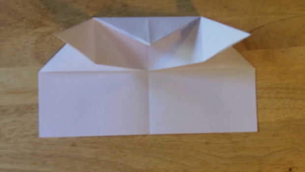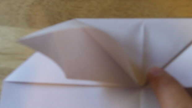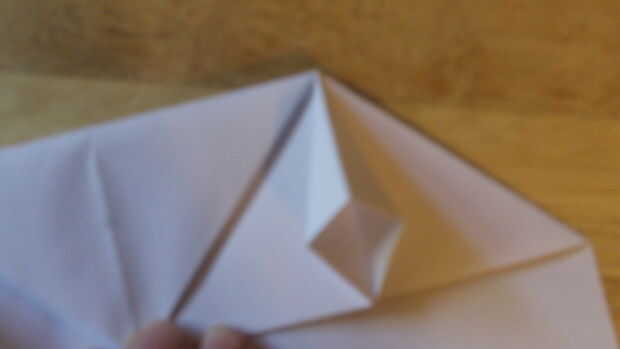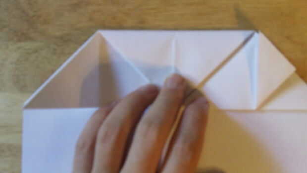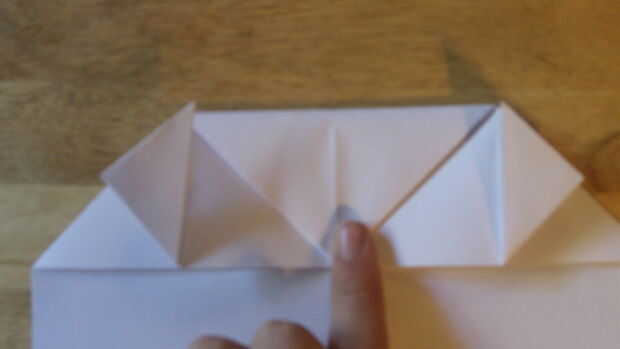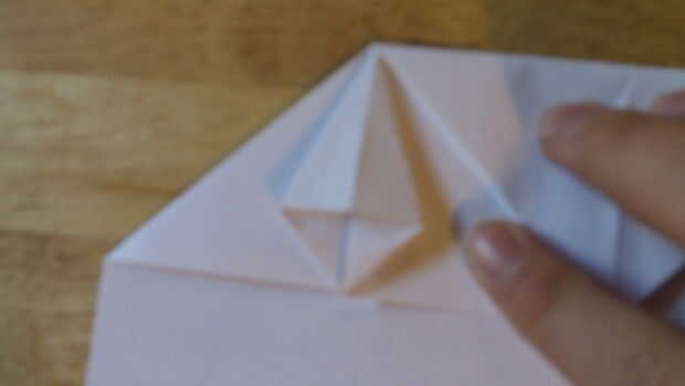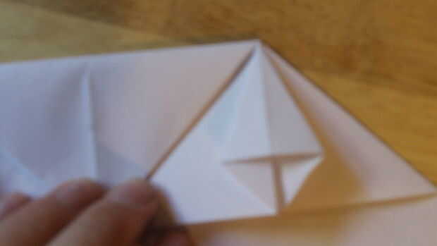 Comenzando por doblar el doblez de "aterrizaje", se debe doblar el papel sobre sí mismo otra vez. Después de que lo hayas hecho, dobla el papel en sí mismo. Después de esto, ahora debe ser un triángulo. Luego aplastar abajo por el centro para hacer la carcasa. Abierto para definirla, entonces aplastarlo hacia abajo a lo largo de las líneas de doblez una vez más. Repita todo esto en el otro lado.