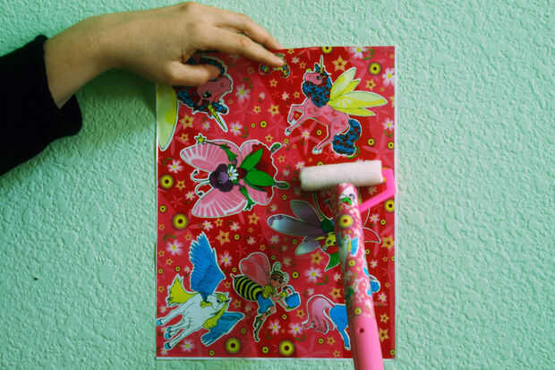 Todo lo que tienes que hacer es aplicar algo de carga estática en la película mientras que sujeta en la pared. Tengo un portátil de Van de Graaff con un rodillo que me ayuda a cargar.