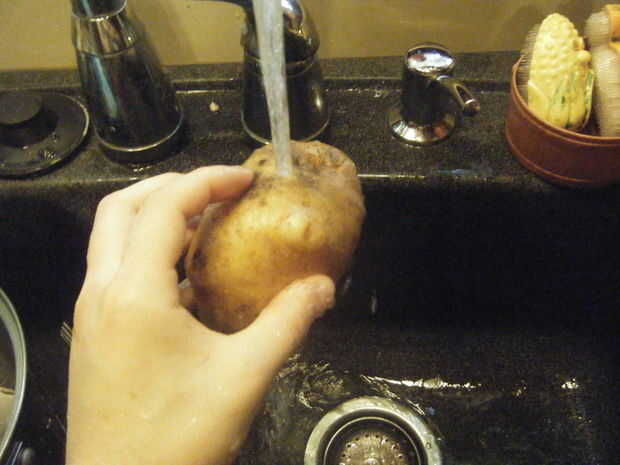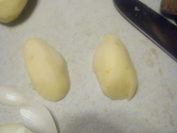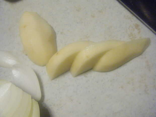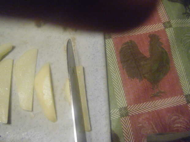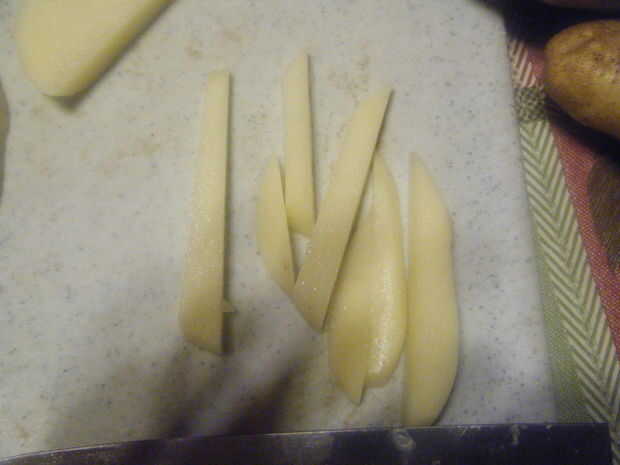 Luego cortarlas en formas que quieres tus papas a ser. Me fui para la forma tradicional de patatas fritas, tipo de un largo rectángulo de cosa con los bordes slanty, pero puede utilizar cuñas, triángulos, lo que sea en trozos flota su barco.