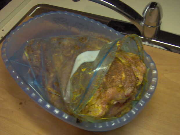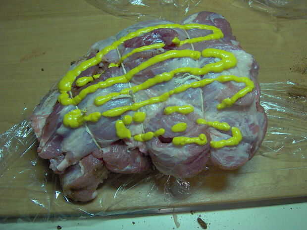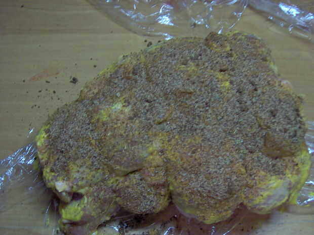 Aplique abundante amarillo mostaza para el jamón y aplicar una buena capa de la mezcla frotar hacia fuera. Luego hacer el otro lado. Nota: La mostaza da la especia algo para ponerte, pero cocinar lejos y deja el sazonador de especias en el jamón. Aunque un masaje, no frote.