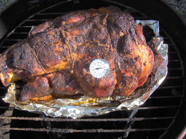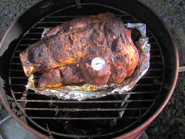 trato de mantener la temperatura a 225 grados pero no superior a 250 grados. No tengo orificios de ventilación en mi tapa, así que tengo que utilizar la puerta para exceso de calor si es necesario. Mediante la adición de 16 carbones cada hora, no he topado el problema de no ser lo suficientemente caliente. Plan en cocinar el jamón durante 6 horas, pero empezar a revisar después de 5 horas. Quiero una temperatura de 180 grados porque yo quiero el jamón slicable. Si cocina hasta 190 grados, alrededor de 1 hora adicional habrá tirado con carne de cerdo. Ambos son buenos, solo depende de lo que vas.