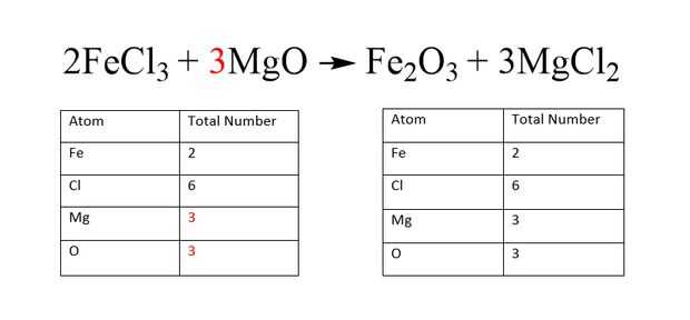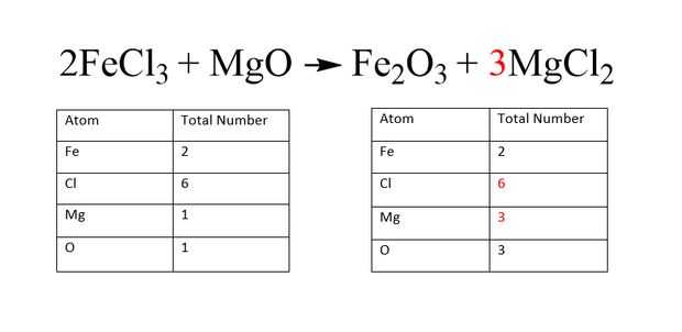 El coeficiente de trae el número de átomo de producto de Mg hasta 3. Para compensar este cambio, la molécula de reactivo que contenga Mg dieron un coeficiente de 3.