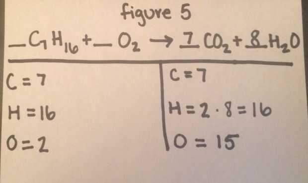 a. en el ejemplo, se necesitaría un 8 para balancear el hidrógeno en el lado derecho para el hidrógeno en el lado izquierdo como se indica en la figura 5.