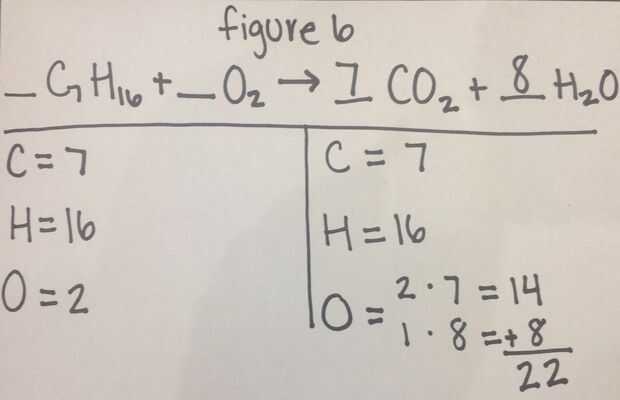 a. puesto que el hidrógeno de la izquierda es con oxígeno, 1 átomo de oxígeno debe ser multiplicado por 8 y agregado a los átomos de 14 ya allí debido a la 7 en CO2 hasta 22 átomos de total de oxígeno como se ve en la figura 6.