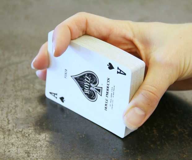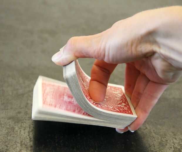 Antes de que te sumerjas aprender las tuercas y pernos de lujo, o 'puente', arrastrando los pies, tomar unos minutos para practicar lo que llama 'estriado'. Esto significa dejar las tarjetas en cascada hacia abajo uno a la vez hacia la mesa (o mano), que controla la velocidad y el flujo con el pulgar, que se encuentra en los bordes superiores de las cartas. (como en la foto)