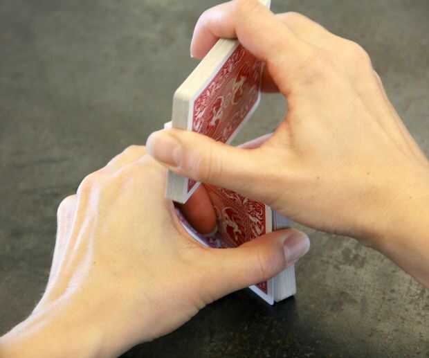 Sujeta la baraja en la mano derecha, rifle medio la baraja en la mano izquierda espera, creando dos pilas de equal(ish).