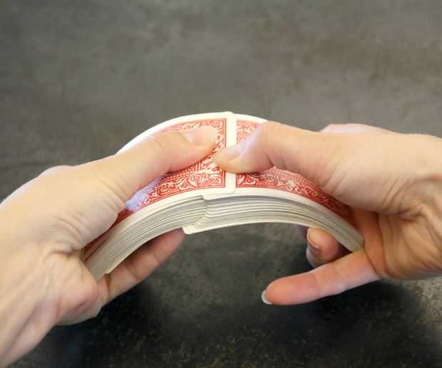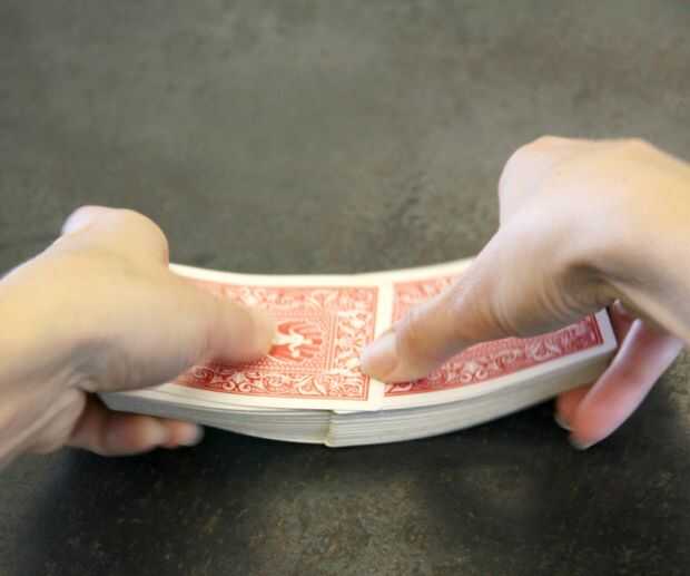 Ahora para conectar las dos mitades en un montón otra vez, oprima los pulgares en la cubierta donde los dos mejores tarjetas superposición. Crear presión hacia el interior por rizado medio, anillo y dedo meñique dedos alrededor de los bordes inferiores de ambas pilas y las tarjetas de la curva para arriba en un arco.