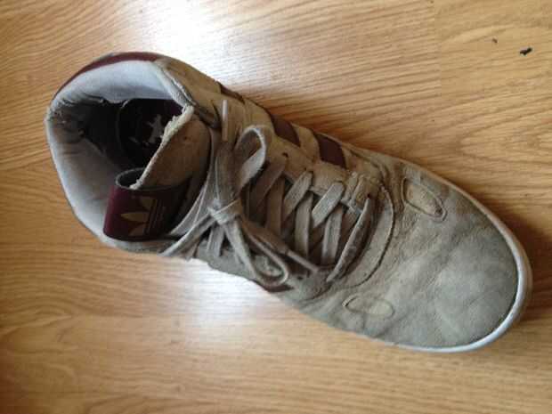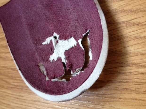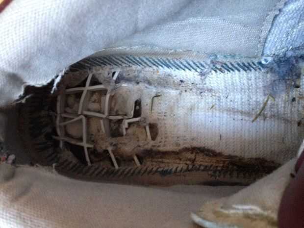 Mis zapatos se hacen para que comen lejos en la plantilla donde está la bola del pie (ver el cuadro 3, son como cuchillos de goma). Quería arreglar esto lo más rápido y barato posible y reforzar para que no ocurra otra vez durante mucho tiempo.