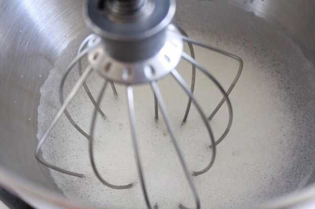 Se trata de la primera etapa de batir claras. Después sobre un minuto o así, los blancos se deben llenar con pequeñas burbujas que se han desarrollado desde que empezamos a incorporar aire en ellos con el bate.