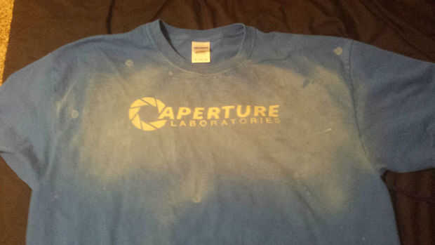Camisas no todo salen como está previsto. Por ejemplo la camisa de laboratorios Aperture anterior fue blanqueada y una pequeña porción sangró a través del papel de congelador. Comió lentamente a mí y no quiero ponerme la camiseta con este defecto pequeño, apenas visible ya. Por lo que me ocurrió la idea de que darle un fondo "splash" y que se vea natural. No sólo le agrego el fondo splash, me gustaría también probar algo que nunca había hecho hasta este punto (con buena razón, pronto llegué a encontrar). Intencionalmente deje mi dedo colgando sobre la bomba de la botella de spray, por lo que cubrió parte de la cabeza de aerosol, similar a enchufar una manguera con el dedo pulgar. Yo sabía que esto crearía gotas de lejía, pensando que distraería aún más de esta mancha apenas visible. Todavía no me gusta la camisa, pero no tiene ningún sentido llorar sobre cada error, que sólo por seguir intentándolo hasta que se quede sin torta.