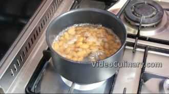 Colocar 200 gramos (7 oz) de almendras en agua hirviendo durante un minuto. Retirar del agua hirviendo.