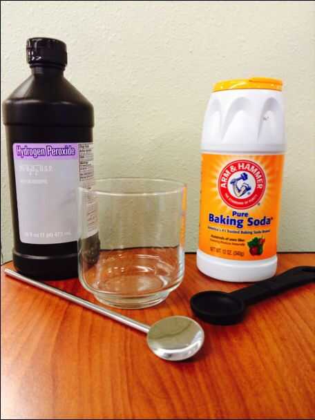 Bicarbonato de sodio (puro) Peróxido de hidrógeno (3%) Cepillo de dientes (preferiblemente diferente al que usas diariamente) 1 vidrio de mezcla Mezcla de herramienta (plata) Una medida de cucharadita