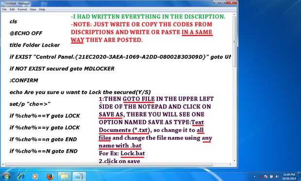 -Tan sólo escribir los códigos en un mismo modo está escrito y guardar como tipo "todos los archivos" con el archivo nombre lock.bat o anything.bat
