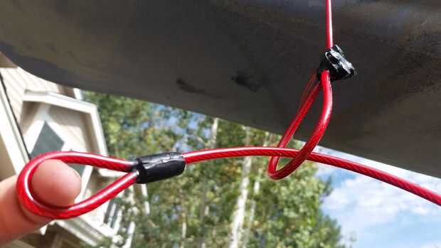 Tengo un kayak de 13 pies y un garaje lleno de gente, y almacenaje horizontal (utilizando un sistema de polea para una bicicleta) era problemático. Por suerte mi garaje lleno de gente tiene un bonito techo alto con vigas a la vista, así que pude aseg