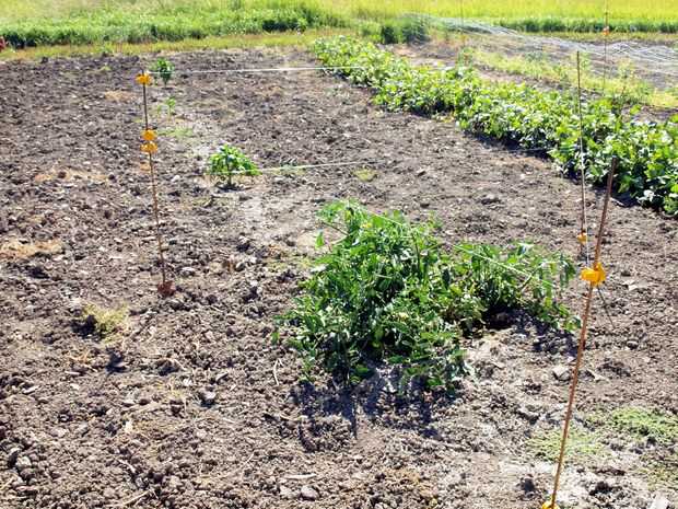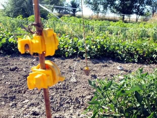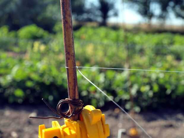 Coloque entre los puestos alrededor de los tomates con un montón de terreno abierto. Atar algunas lineas de pesca para un puesto y carrete hacia fuera para otro post. Cortar en algún lugar en el centro y atar una cuerda de trampa en cada extremo cortado. Atar a lo otros post y si la línea es un poco flojo luego envuélvalo alrededor del poste hasta su agradable y tenso. No conseguir que apretado y partió de la trampa. Continúe alrededor de las plantas de línea de corriente donde quiera parece que puede bloquear el camino de los ciervos. Cuando listo se debe ver lo que casi parece como una tela de araña pasando por el jardín.