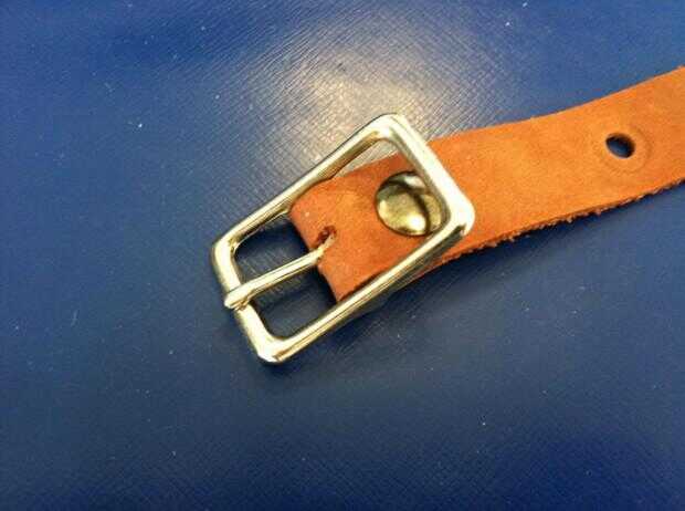 En un extremo de las correas corte una ranura donde la hebilla irían y luego perforó un agujero a cada lado para el tornillo. Aquí le damos la hebilla con el tornillo de chicago en el lugar: