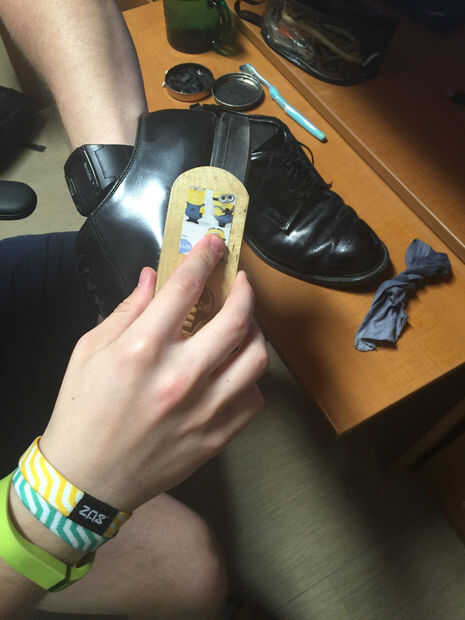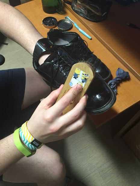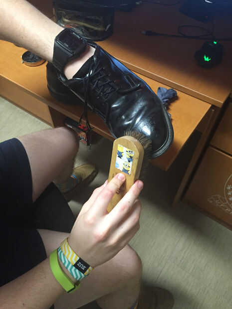 La zapatilla de limpieza es un paso importante en este proceso porque si los zapatos no están limpios, después el pulimento no se quedará en el zapato. Tome el cepillo y frotar ligeramente el zapato para obtener cualquier suciedad o mugre del zapato (cuadros 1-3). Así como la limpieza del zapato, este paso suaviza cualquier arañazos de la superficie de los polacos, lo que facilita aplicar pulimento del zapato.