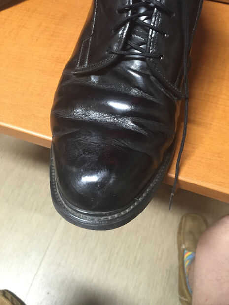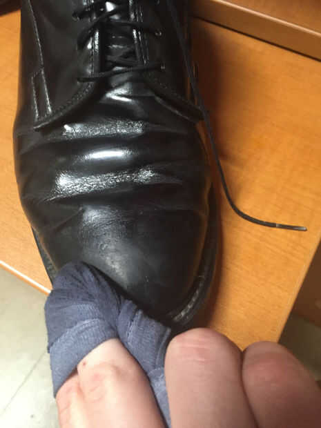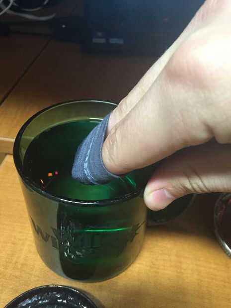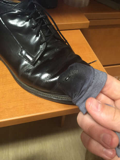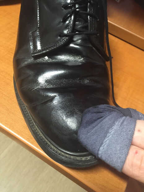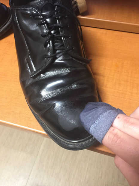Después de la primera que son pocas capas en el zapato, desea iniciar centrándose en la punta del zapato, ya que es lo que otros se centrarán. Usando la Técnica básica, poner una capa de esmalte en la punta del zapato (cuadro 1 - 2). Después de esto, toma su taza de agua tibia, sumergir la punta de los dedos de trapo cubierto de agua y unas gotas de agua en ellas (cuadro 3). Es importante que no te los dedos demasiado mojados, como esto se tornillo encima de la capa de esmalte.