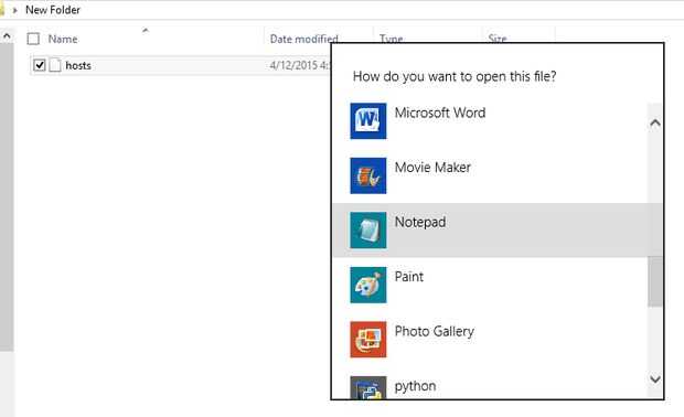 Esto es donde se encuentra el archivo hosts , ahora copia ese archivo a la carpeta nueva que has hecho y haga doble clic en él. Se le pedirá con que software para abrirlo, elija Bloc de notas o cualquier texto que prefiera software de edición. Ahora podría tener una pregunta, ¿por qué al copiar el archivo hosts a otra carpeta y por qué no editar directamente? Bueno, eso es porque, cuando te tratas de editar archivo hosts directamente, sistema windows no le permite hacerlo, así que para superar esto, el archivo hosts debe ser copiado a otro, directorio no protegido (por ejemplo, carpeta que hemos creado en el escritorio) ver fotos de instrucciones gráficas.