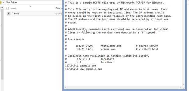 como ustedes ya saben archivo hosts asigna direcciones ip a sus dominios (ver foto), eso significa que si vas Agregar dominio (por ejemplo:) ejemplo.com y archivo hosts para asignarle alguna dirección ip (por ejemplo: 127.0.0.1), cuando el usuario abrirá example.com navegador y tipo, computadora automáticamente le redirigirá al sitio web en 127.0.0.1. La forma de hacerlo en anfitriones tiene este aspecto: el dominio que vamos a utilizar es ejemplo.com y la ip del sitio al que vamos a redirigir a los usuarios es 127.0.0.1, así que para hacer esto Agregar esto en archivo hosts :