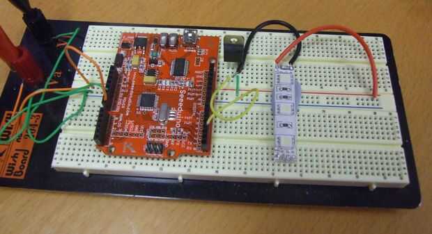 Utilicé un Arduino para probar el concepto y mi banco de pruebas se muestra en la foto. Tengo la idea de circuito desde aquí: http://www.ladyada.net/products/rgbledstrip/ sólo usé 1 canal (blanco) en vez de 3 (RGB).
