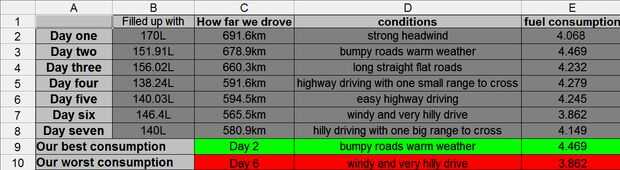 Voy a utilizar relleno de cinco y seis como un ejemplo de lo que va a hacer; con el odómetro y cuánto se llenaron está listo para comenzar. Mi odómetro en llenar cinco 412666.6 km, llenó de 140,03 L esto va a ser el comienzo de mis lecturas (nota, para su primer llenado que no necesita la cantidad que se llenaron para arriba). Su primer cálculo va a ser en el segundo relleno. 6 llenar mi odómetro Lee 413232.1 km, llenó de 146.4 L. Ahora comienzan los cálculos. Restar 413232.1 (su segundo terraplén) de 412666.6 (su primer llenado), la respuesta es 565.5 que lo manejé, anote este número. A continuación, división lejos le condujo (565.5) por cuánto llenó (146.41 L) la respuesta es su consumo de combustible (3.862kpl) ahora Anote el consumo de combustible y las condiciones y haya - hasta el siguiente relleno que se... Después de haber hecho su primer cálculo su libro un poco este aspecto: