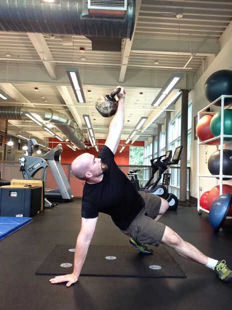 - Tratar de trazar una línea recta de kettlebell, directamente a través del brazo, al hombro, por el otro hombro, el hombro opuesto y por el otro brazo recto en el suelo.