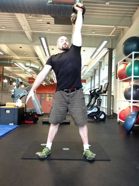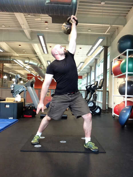 8. Enderece ambas piernas en una posición modificada de la estocada y luego paso a una posición de pie, pies separados de la anchura de los hombros. Conducir los hombros y el kettlebell hacia el cielo.